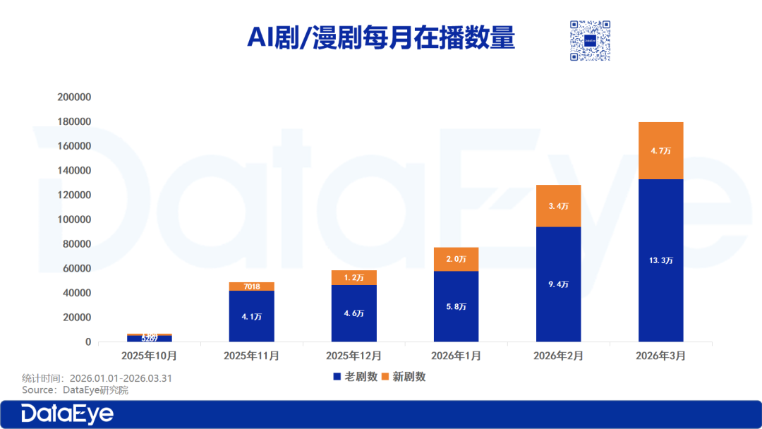 过去两年,AI短剧/漫剧以惊人速度完成了从新事物到红海市场的蜕变。DataEye数据显示,仅2026年1月一个月,国内AI漫剧上线数量就创下新高,达到14634部,平均每天有470多部新剧上线;截至2026年2月末,在播AI剧/漫剧总数已达12.78万部,是2025年全年的整整两倍。