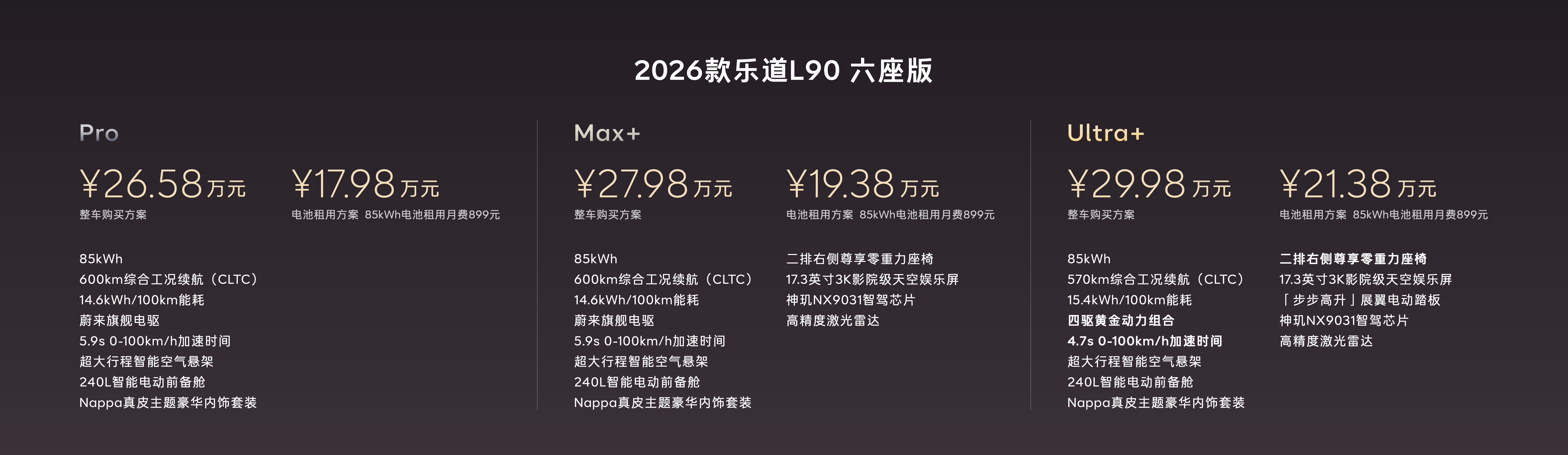 六座版 Pro,整车购买售价为 26.58 万元,采用 BaaS 电池租用方案的售价则为 17.98 万元;