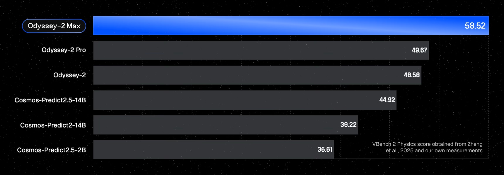 - VBench 2 物理得分 58.52,高于 Odyssey-2 Pro(49.67)和英伟达 Cosmos-Predict2.5-14B(44.92)