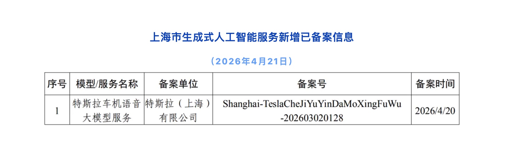 根据上海市网信办披露的信息,特斯拉(上海)有限公司已于 4 月 20 日完成「特斯拉车机语音大模型服务」的生成式 AI 备案,备案号为 Shanghai-TeslaCheJiYuYinDaMoXingFuWu-202603020128。