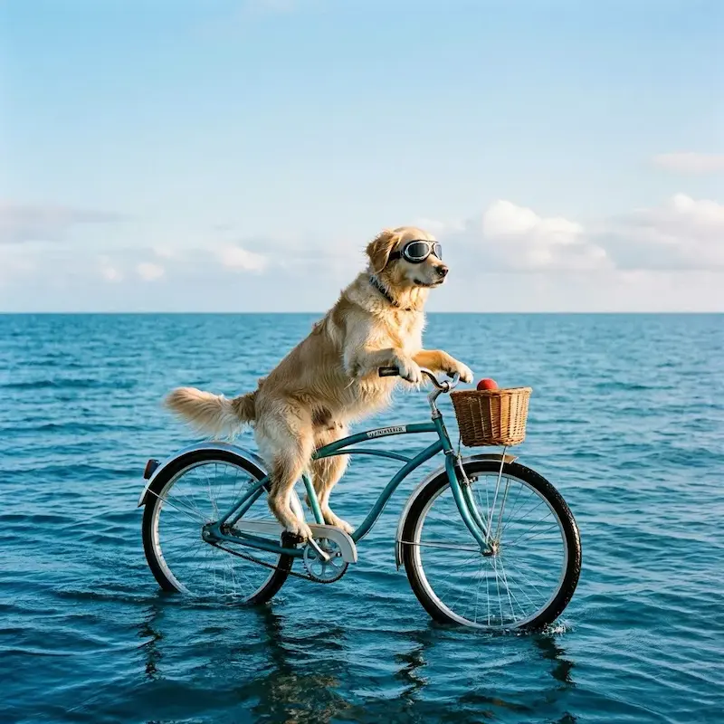 我试用后,图像质感确实很好,非常逼真。比如,一只狗在海里骑自行车。