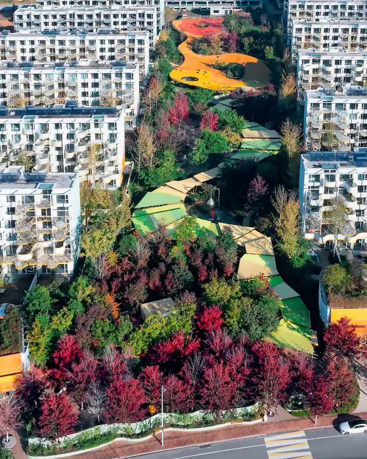 山东日照某住宅小区的彩色风雨连廊,入口处树林还设了咖啡馆。(via)