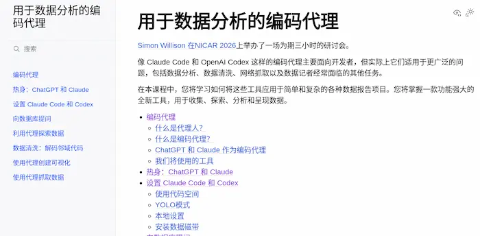 著名开发者 Simon Willison 的培训班讲课资料,通过 AI 工具进行数据分析,有详细步骤。
