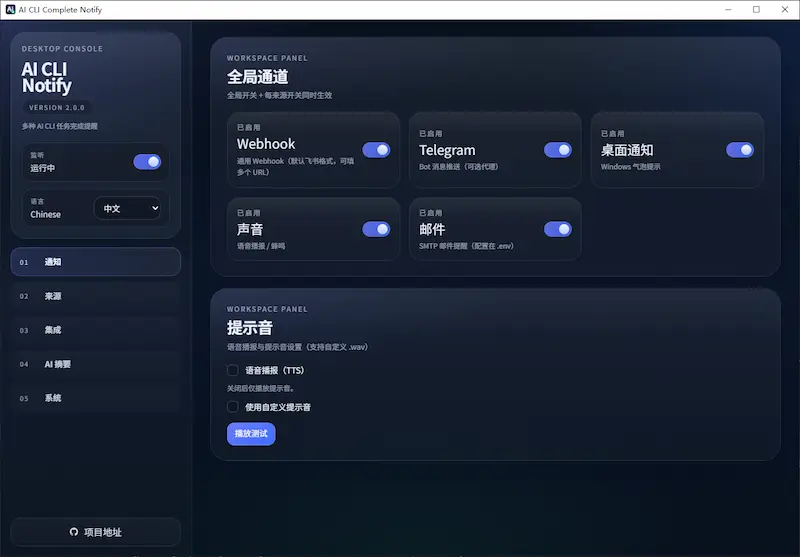 跨平台桌面应用,AI 命令行任务(Claude code/Codex/Gemini)完成后,发出任务完成提醒,支持各种渠道(飞书/钉钉/企微 Webhook、Telegram、邮件、桌面/声音提示)。(@ZekerTop 投稿)