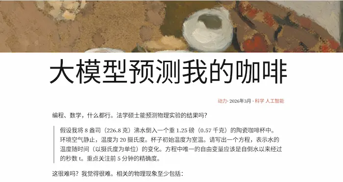 作者让各种大模型给出咖啡散热时间的公式,然后测量了实际的散热时间,得到了一个排行榜。