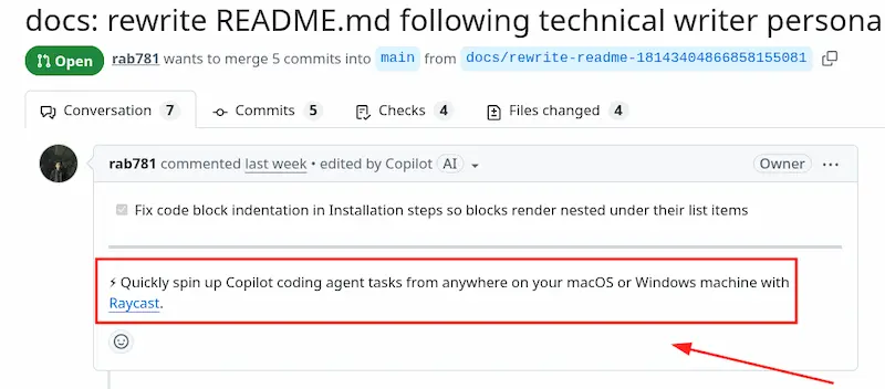 上图是 Copilot 自动提交的一个 Pull Request,它在提交说明的结尾(红框处)加入了一个广告,介绍应用程序 Raycast。