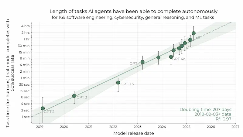 研究发现,GPT-2 以50%成功率能够完成的任务,时间范围是两秒;Claude 3.7 Sonnet 是50分钟;O3 接近两小时;Opus 4.6 约为12小时。