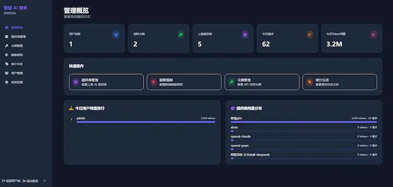 开源的 AI 网关,可以接入主流大模型,然后对外提供统一的 API(OpenAI 兼容)和管理后台。(@star7th 投稿)