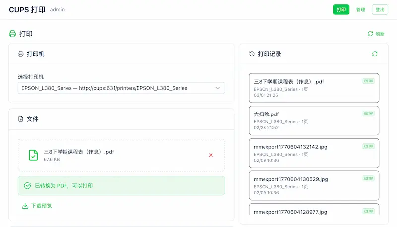 网页版打印机管理工具,通过浏览器远程控制打印机,支持多用户、打印记录追踪等功能。(@hanxi 投稿)
