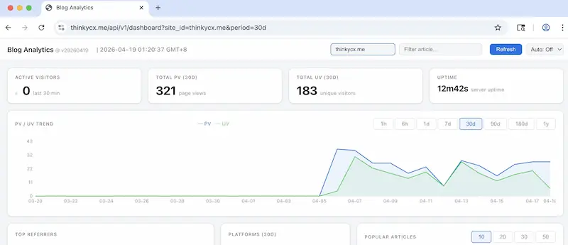 开源的访客统计服务,提供 PV/UV 统计、热门文章、趋势图等,一个实例服务多个站点。(@thinkycx 投稿)