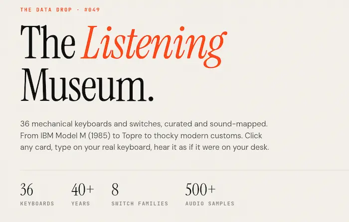 一个有意思的网站,收集键盘打字的声音。你可以先听一下某种键盘的打字声,再确定是否购买它。