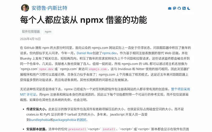 有人为 npmjs.com 做了一个新的前端 npmx.dev,解决了很多开发者要求已久的功能。
