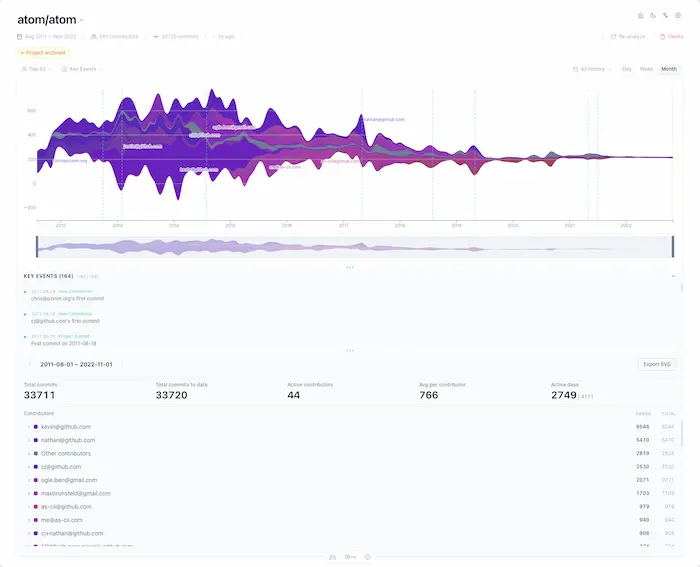 Git 仓库提交历史的可视化河流图,支持多项目对比、贡献者信息等特性,在线体验。(@Lionad-Morotar 投稿)