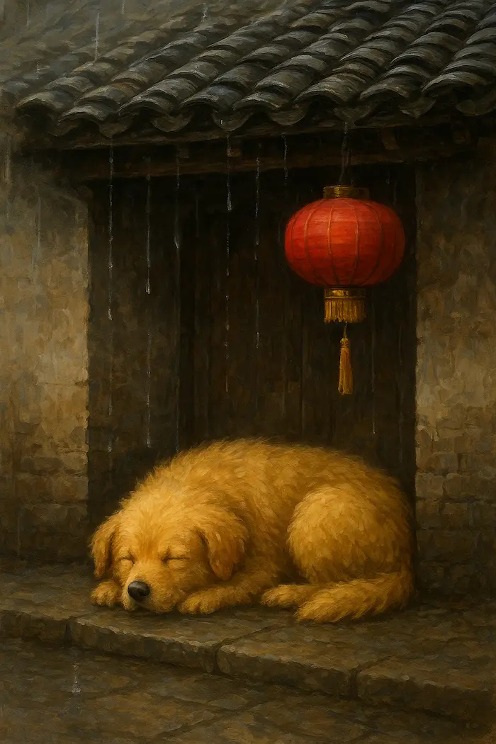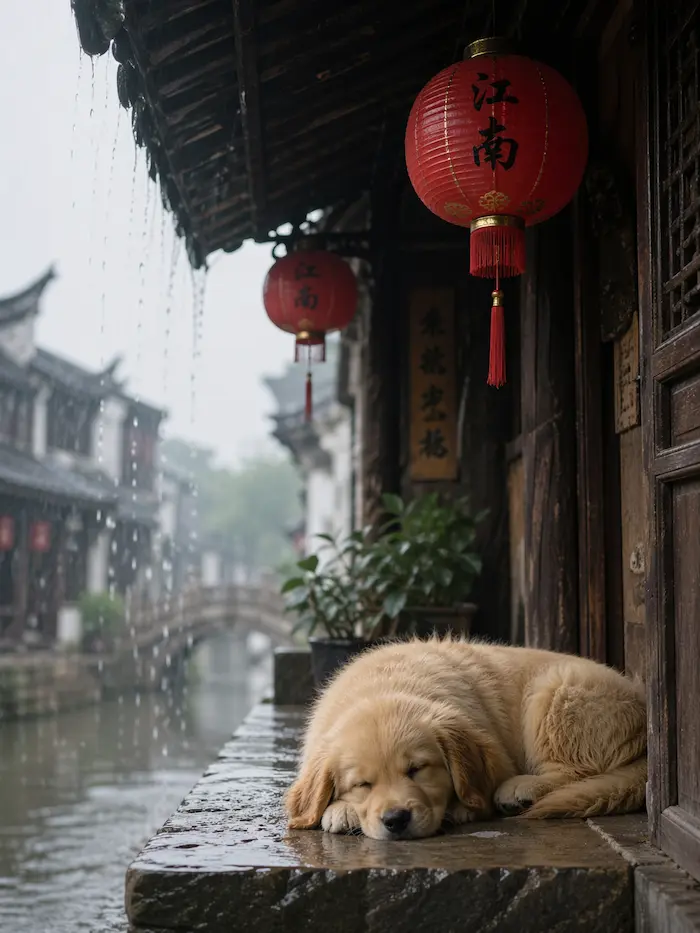 我做了一个比较,生成一张小狗在古镇屋檐下午睡的图片。这是 GPT Images 1 的结果。