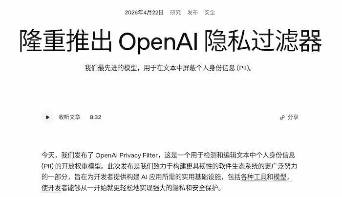 比如,原文是"产品发布日期是2026年9月18日",处理后就是"产品发布日期是[PRIVATE_DATE]",参见介绍文章