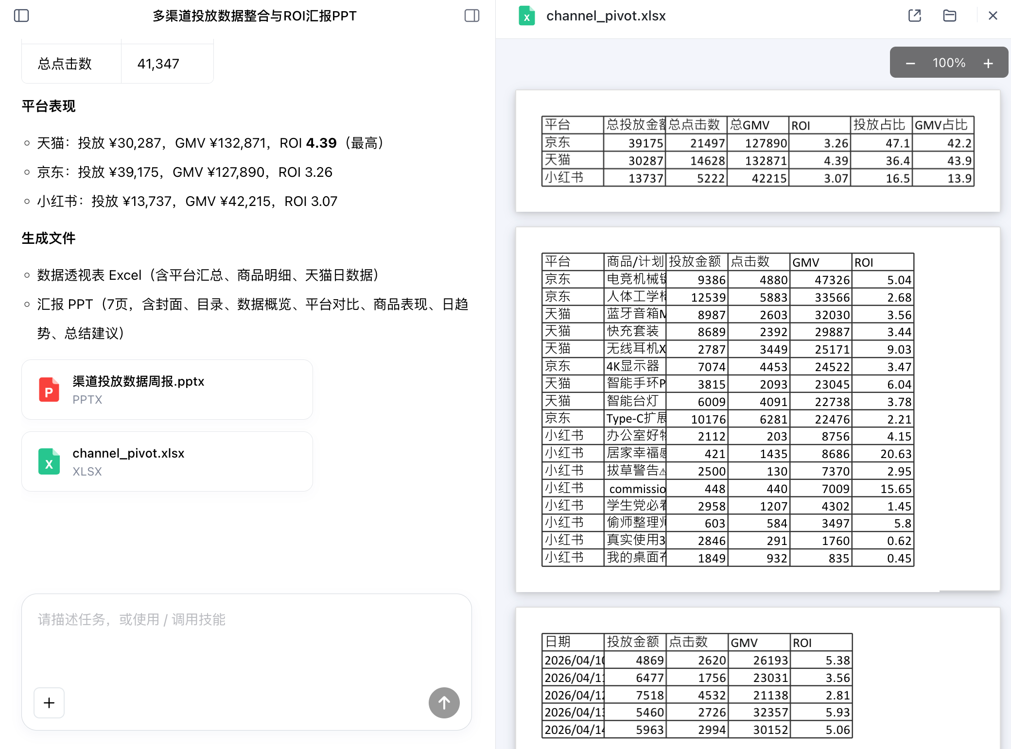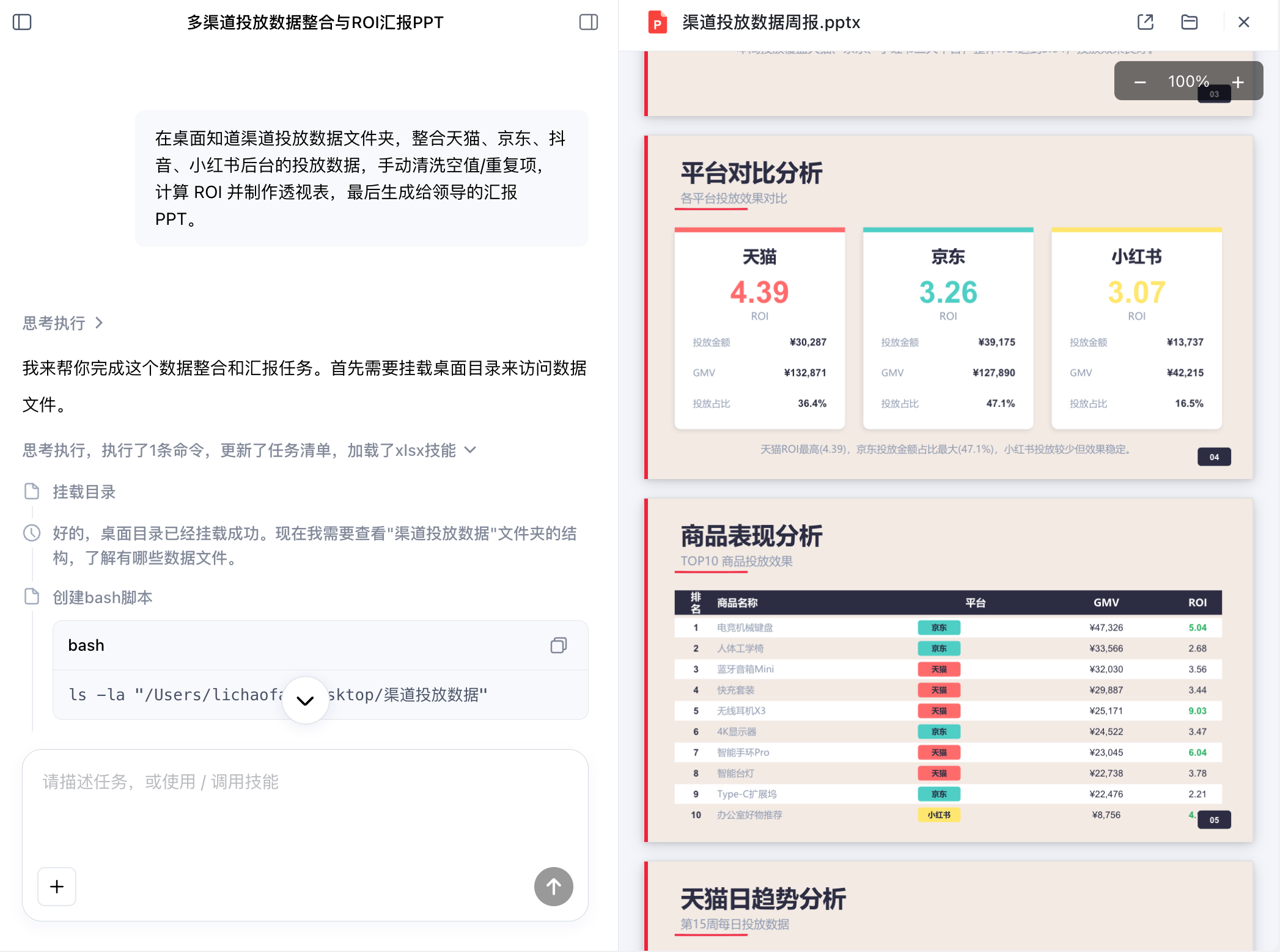 它开始逐个读取 Excel,自动识别不同平台的字段差异,统一列名,剔除空行和重复记录,按渠道计算投入产出比,生成了一份带透视表的汇总 Excel。然后基于这些数据,自己搭了一份 PPT:封面、各渠道 ROI 对比柱状图、投放趋势折线图、问题渠道标红、末尾一页总结和建议。