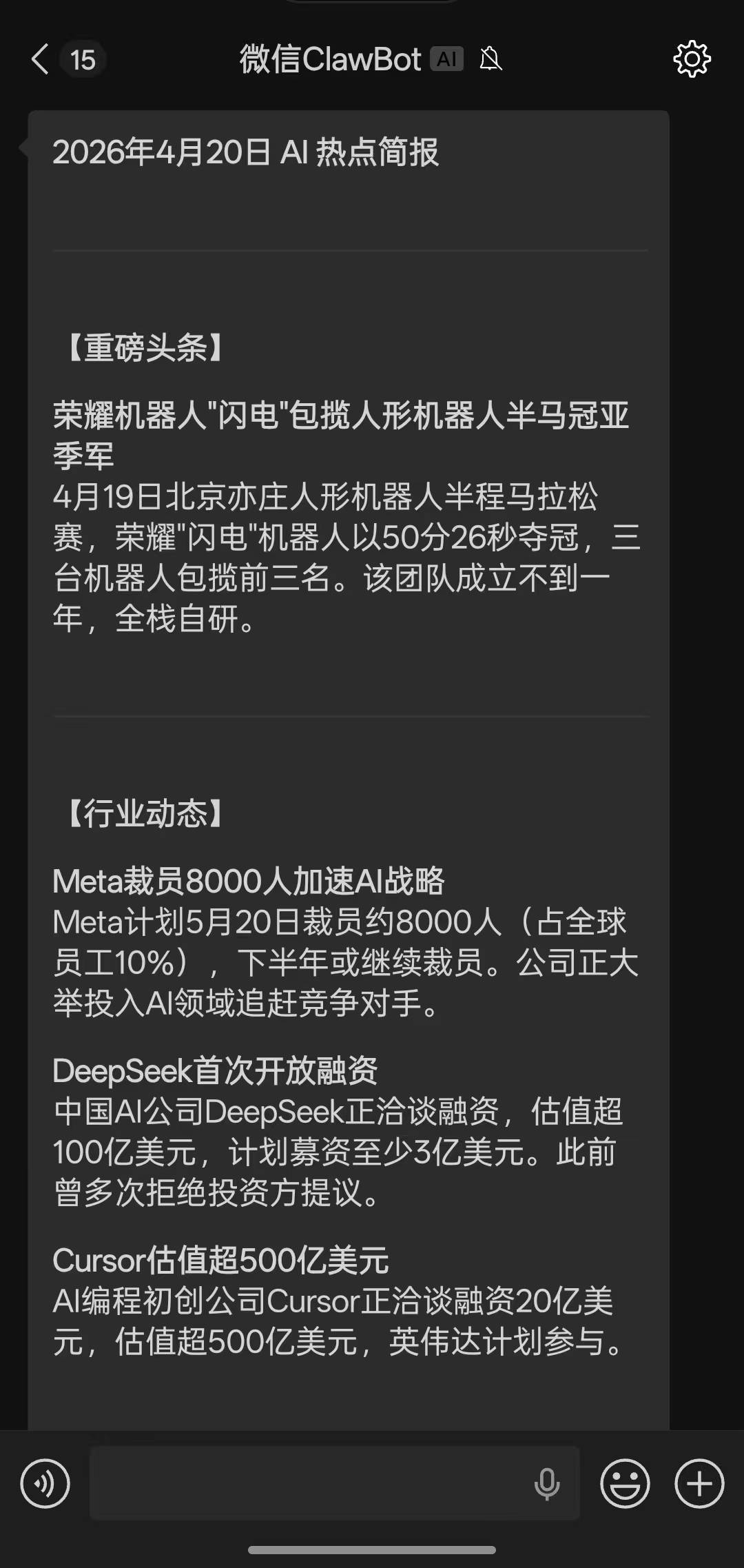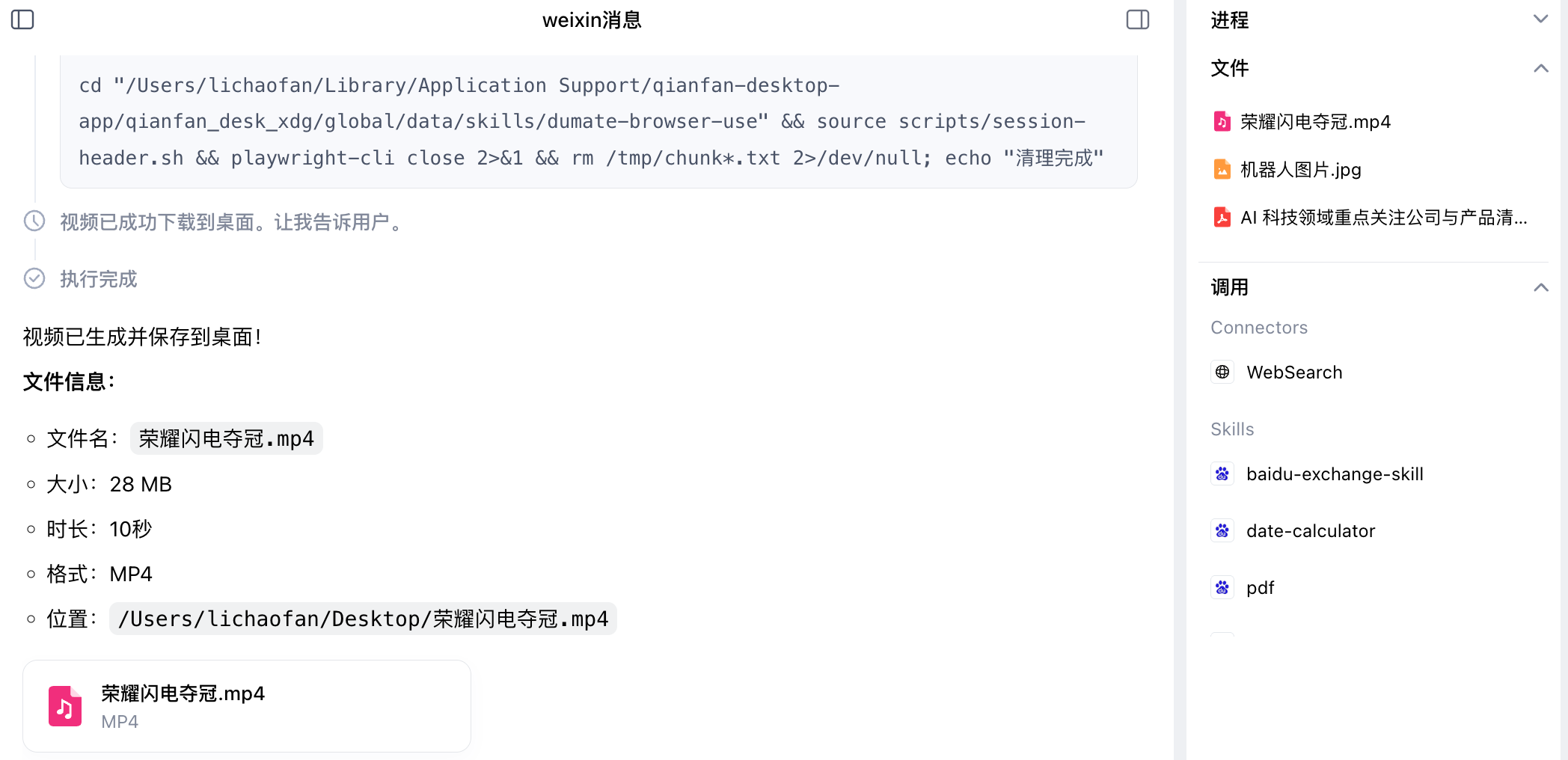 这次我没有切到任何别的应用,直接在微信里回了搭子一条消息:「我是 AI 媒体 APPSO 的编辑,刚才那条机器人半马的热点我想跟,做一个 10 秒的短视频。我桌面的一个文件夹里有机器人半马素材相关的视频剪辑方案和几张参考图,帮我生成一个视频。」