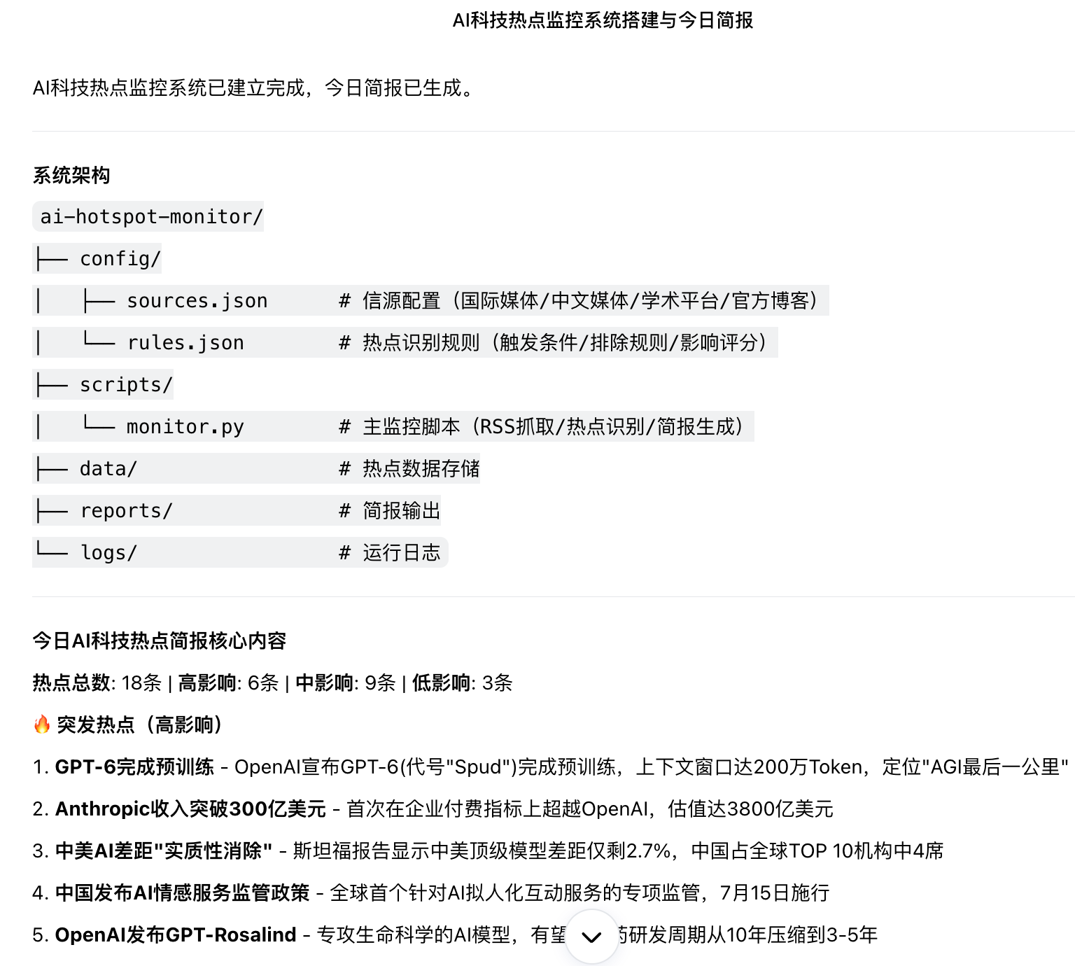 每天早上醒来,当天的热点已经整整齐齐躺在那里了。哪些重要性和热度更高,哪条是突发新闻,哪条是深度分析,哪条适合跟进做选题,它都帮我分了类。