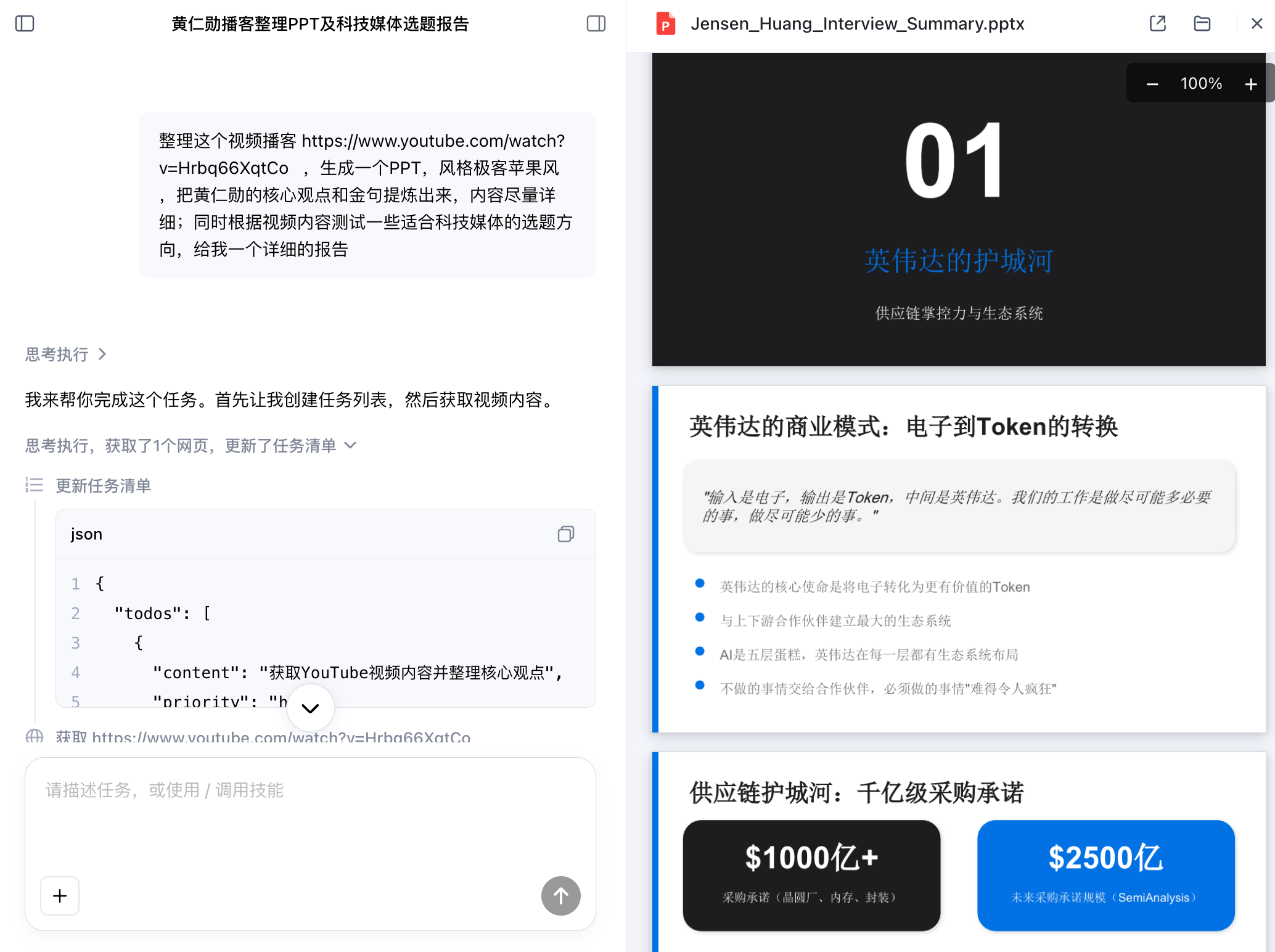 它先访问了视频链接,提取了完整的语音内容并转写,然后逐段分析,把黄仁勋的核心论点整理成结构化的 PPT,将访谈划分章节并整理出黄仁勋的金句。