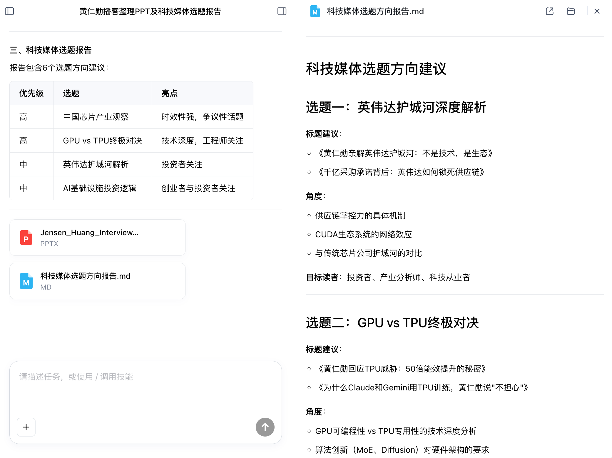 黄仁勋最近有一期很火的视频播客,我想把它变成一份可以内部分享的材料。我对搭子说:「整理这个视频播客,生成一个极客苹果风的 PPT,把黄仁勋的核心观点和金句提炼出来,内容尽量详细。同时根据视频内容测试一些适合科技媒体的选题方向,给我一个详细的报告。」