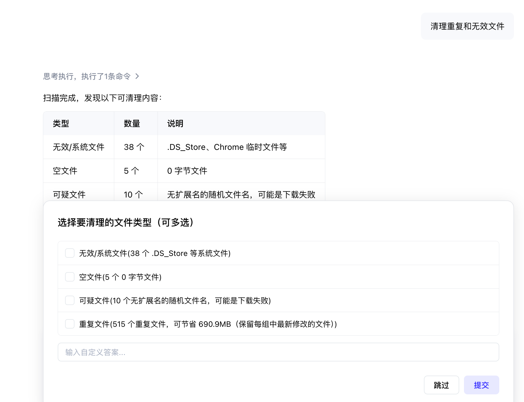 删除、移动这类风险操作有二次确认,整个执行过程在屏幕上实时展示,你随时可以叫停。