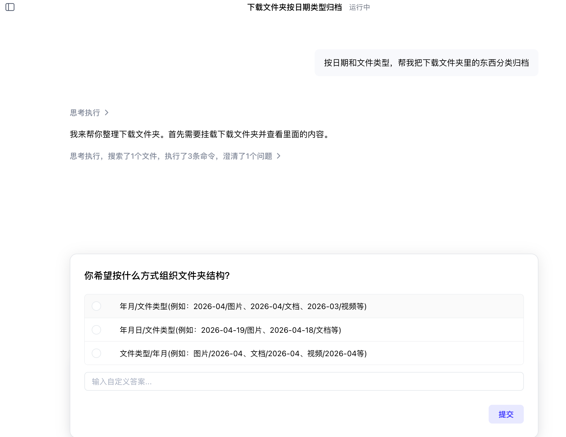 这次我对搭子DuMate 说了一句:「按日期和文件类型,帮我把下载文件夹里的东西分类归档。」