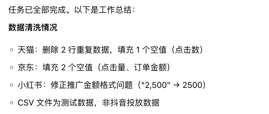 我把四个平台的投放数据丢到桌面一个文件夹里,然后对搭子DuMate 说:「整合这四个平台的投放数据,清洗空值和重复项,计算各渠道 ROI,做透视表,最后生成一份汇报 PPT。」