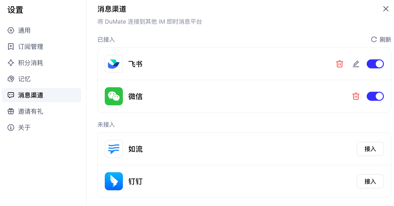 搭子DuMate 打通了微信、飞书、如流、钉钉等主流的 IM 软件,基本也是一键绑定。然后接下来发生的事让我觉得AI 在我的工作流里真正跑通了。