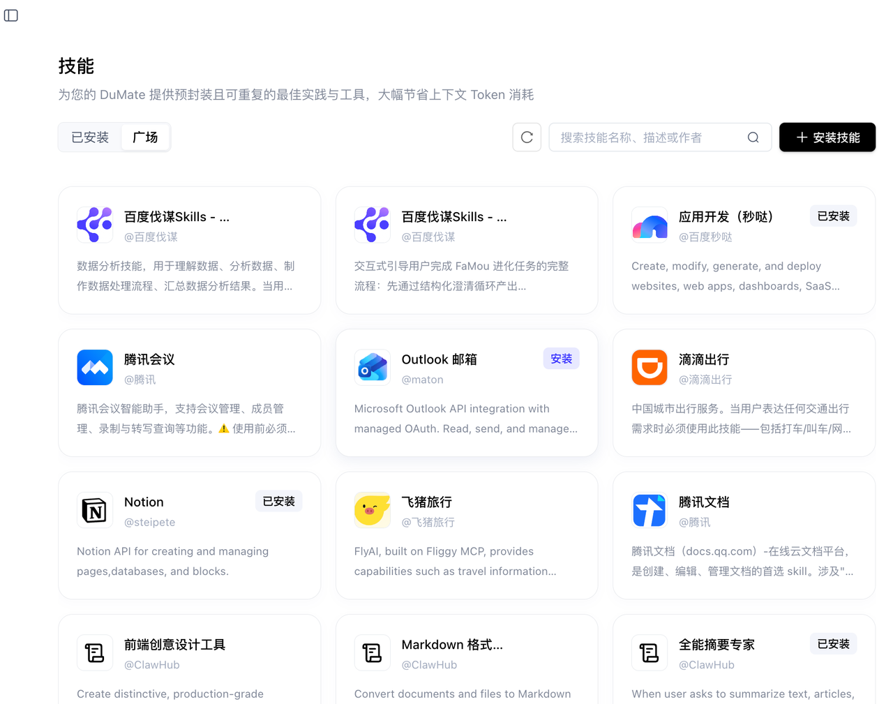 说到 Skill 多提一句。搭子DuMate 兼容 OpenClaw 标准,ClawHUB 里的第三方 Skill 可以直接导入。OpenClaw 社区积累的那些扩展资源,拿来就能用。它自己的技能广场里也有一堆现成的可以选装,腾讯文档、飞猪、滴滴都在。