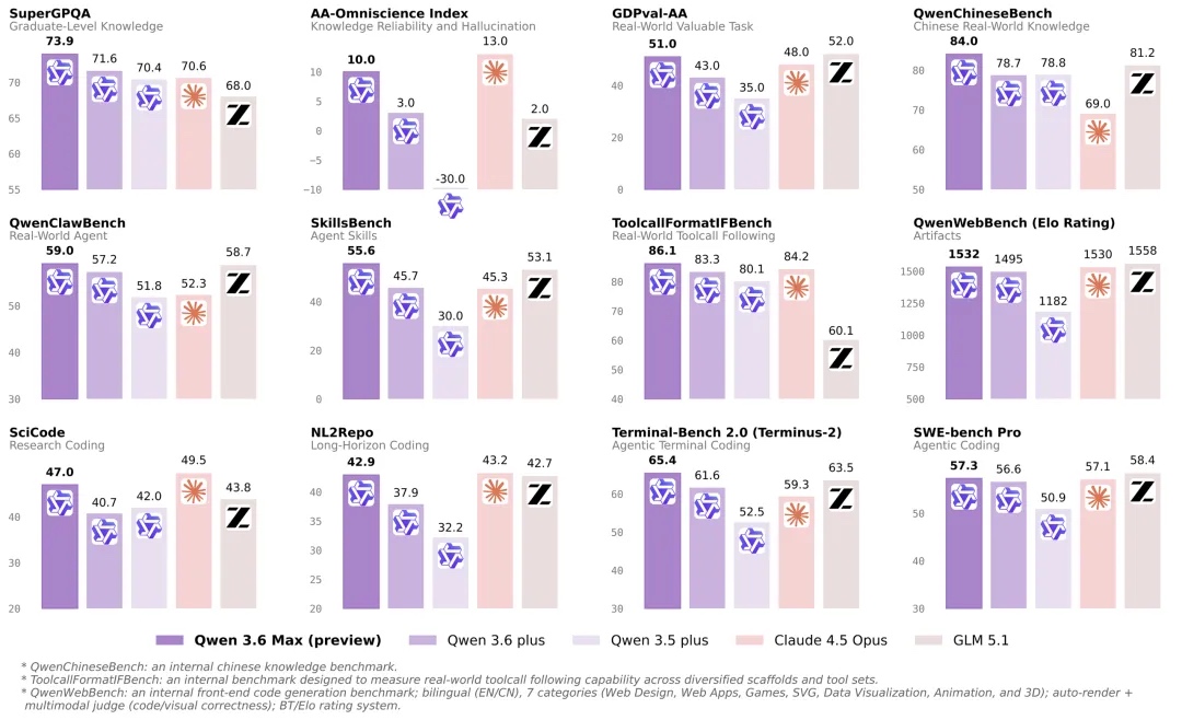 官方称,该模型在 SWE-bench Pro、Terminal-Bench 2.0、SkillsBench、QwenClawBench、QwenWebBench 和 SciCode 六项主要编程基准上均取得最高分。