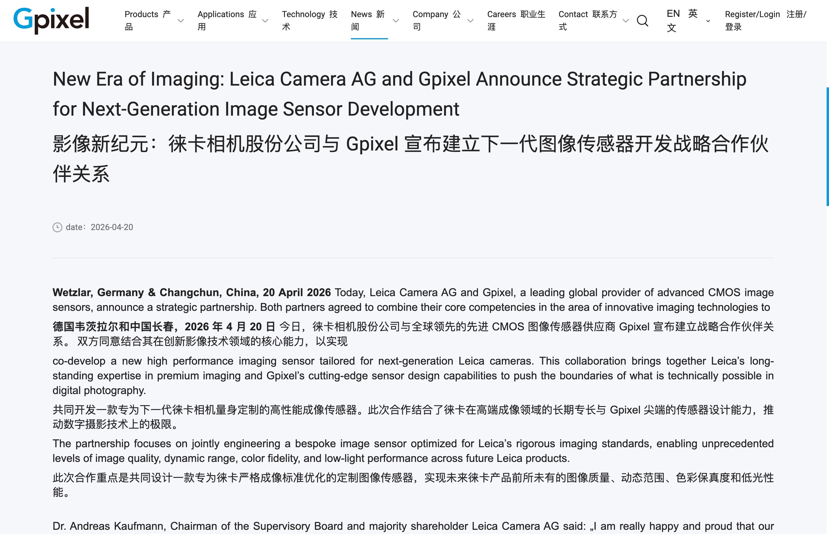 国产 CMOS 图像传感器供应商长光辰芯(Gpixel)昨日与徕卡正式宣布战略合作,双方将联合为下一代徕卡相机定制开发一款高性能 CMOS 图像传感器芯片。