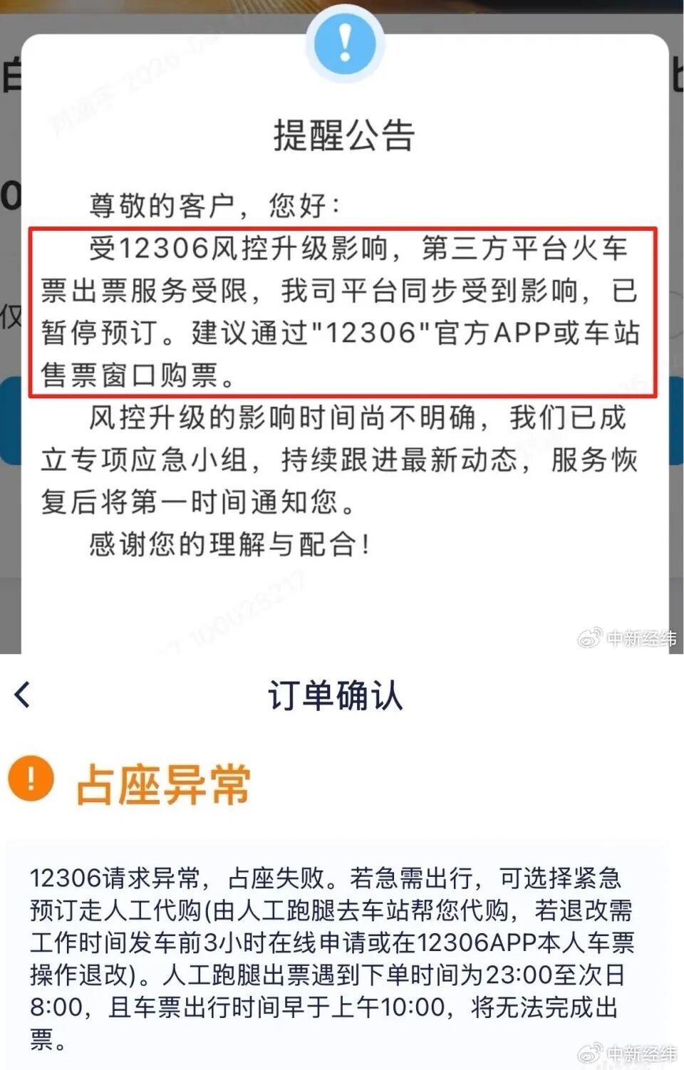 据中新经纬报道,「五一」假期购票高峰期间,12306 平台启动风控升级,多个第三方商旅平台的火车票出票功能出现异常波动。