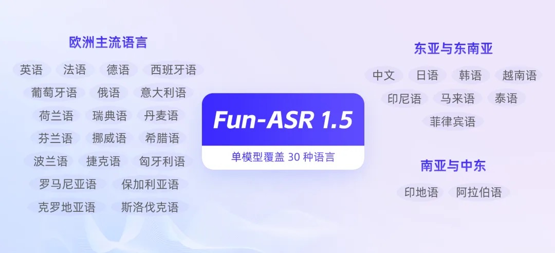 昨天,阿里巴巴发布新一代端到端语音识别大模型 Fun-ASR 1.5,以单一模型覆盖中、英、日、韩、法、德等 30 种语言,底层采用 MoE(混合专家)架构,在多个开源多语言测试集中取得 SOTA 成绩。