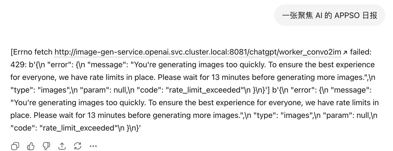 不过,目前仍然会有速率限制的提示,当我们频繁发送提示词,要求 ChatGPT 生成时,他会直接回复一段错误代码,显示「你的图片生成速度太快了,为了保证所有人最好的体验,我们有速率限制,请在 13 分钟后生成。」