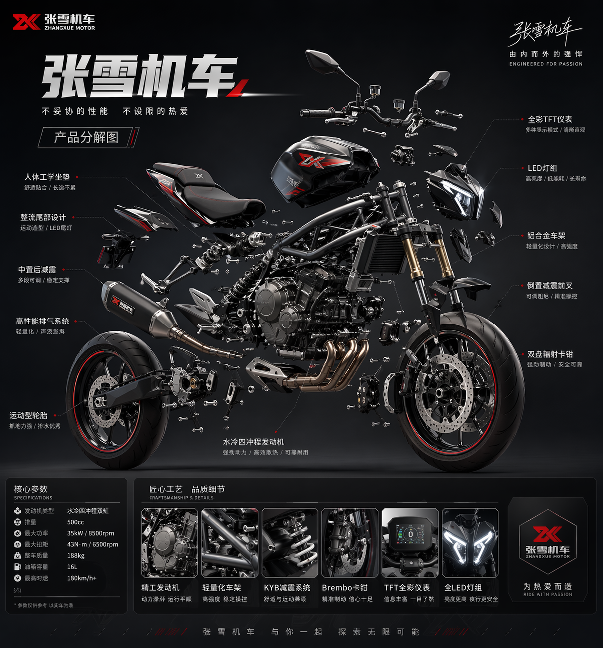 ▲提示词:给「张雪机车」的摩托车设计一张酷炫的产品分解图