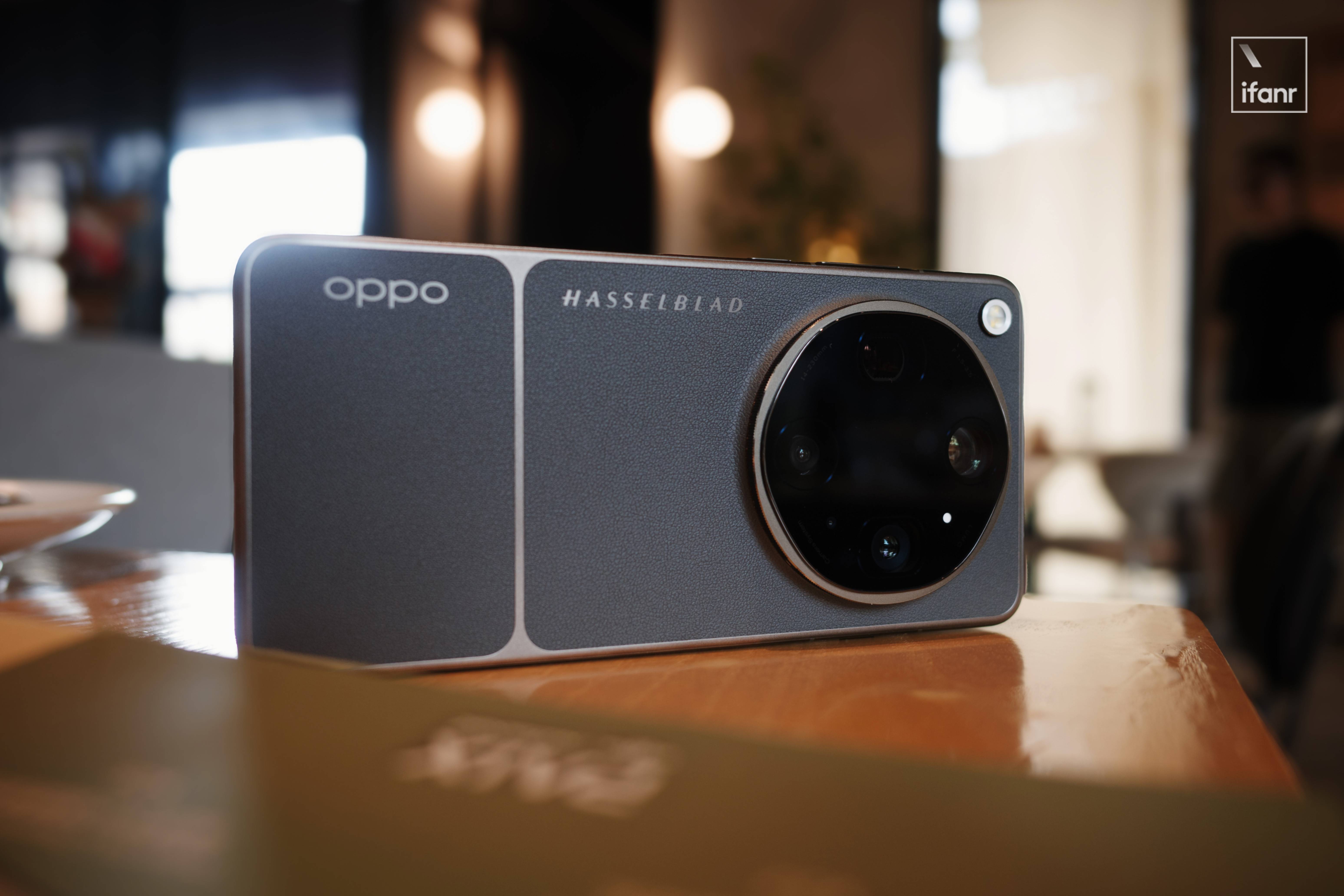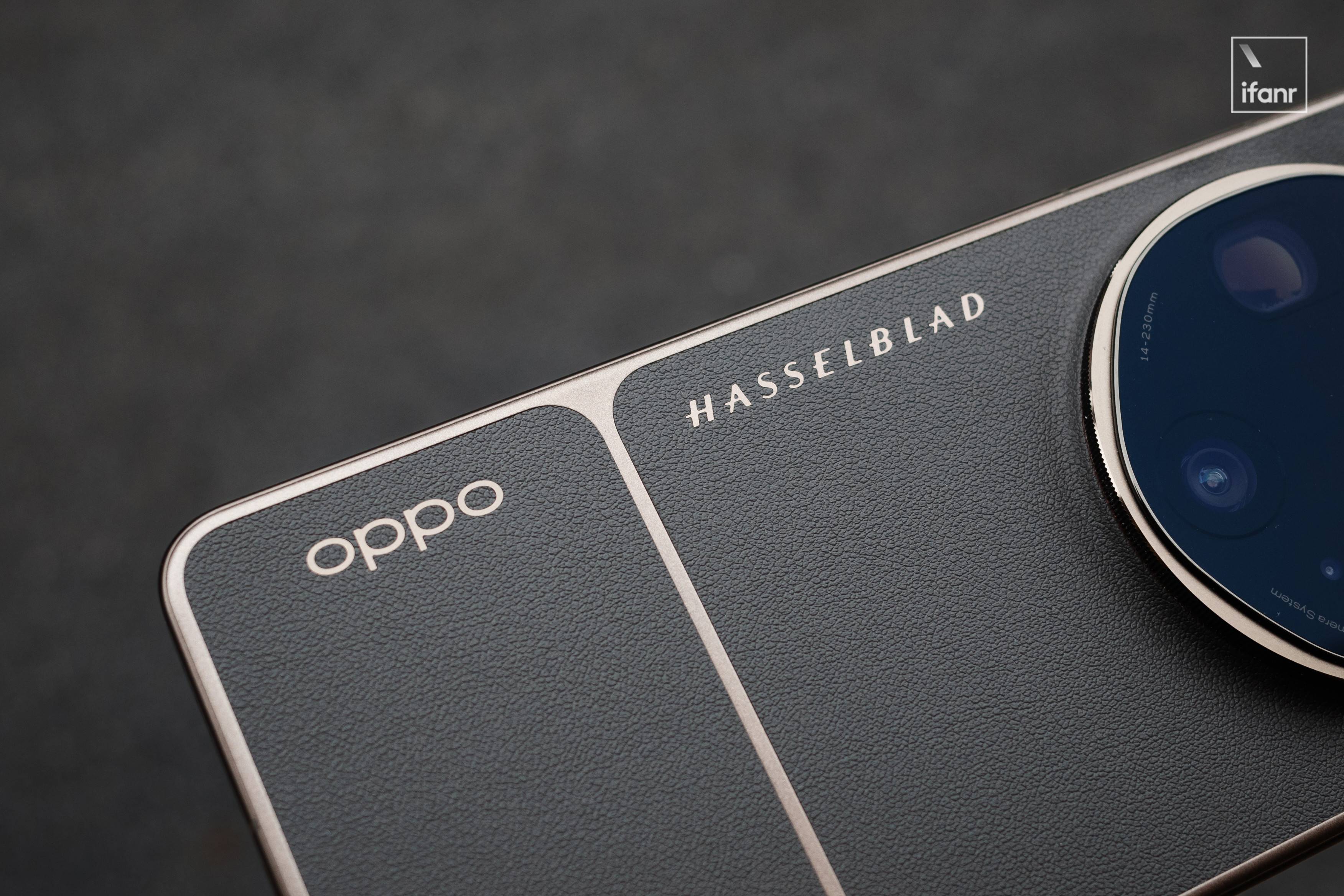而大地苔原配色的背部被素皮一分为二,OPPO Logo 变为侧边纵置在底部皮革上,影像 Deco 中的「H」标志也移到素皮上扩展成 Hasselblad 全称,并与 OPPO Logo 对齐,像老式相机的铭牌一样纵向排布在侧边。