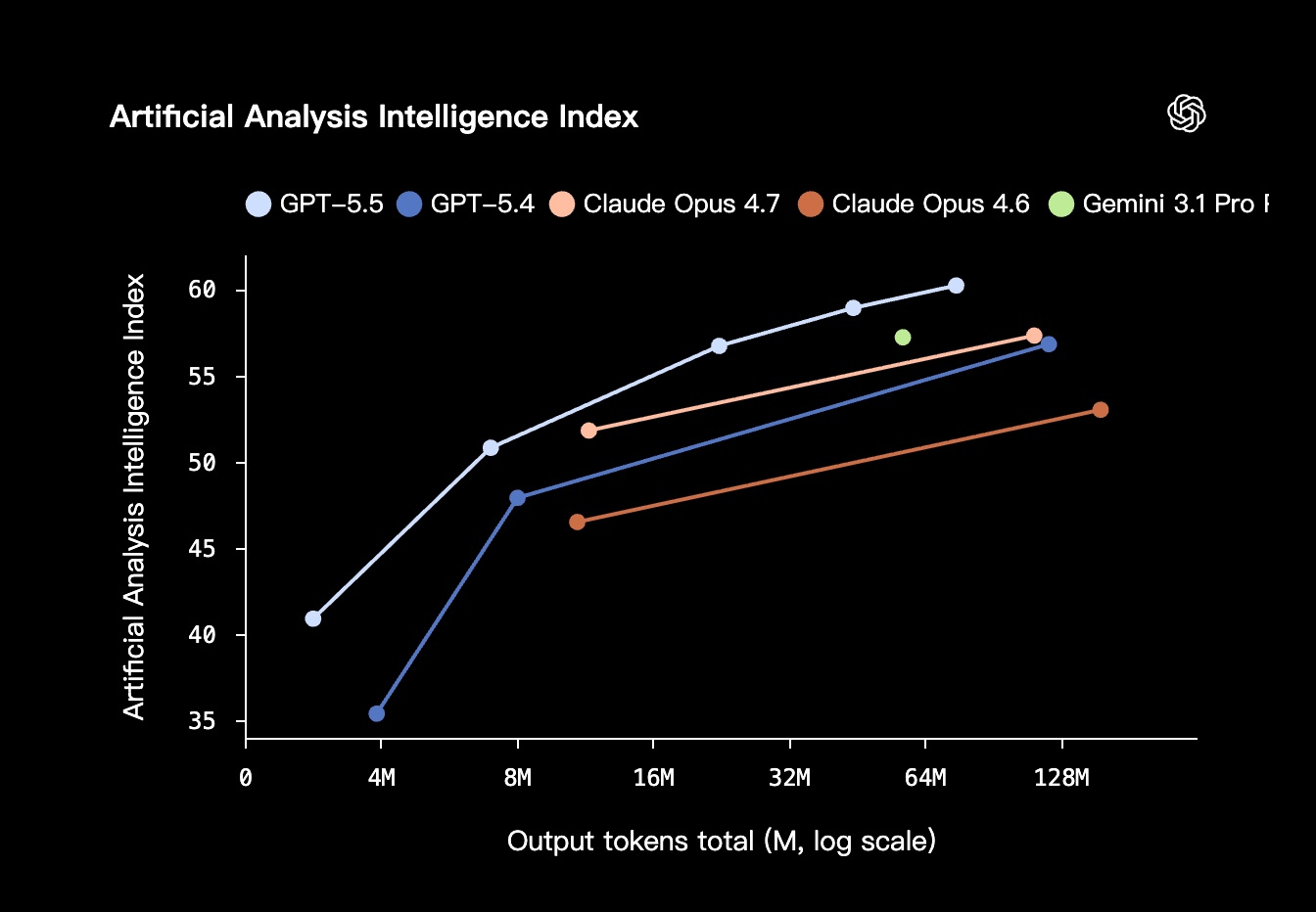 - 与英伟达 GB200/GB300 NVL72 系统联合设计,每 token 延迟与 GPT-5.4 持平,同时通过负载均衡优化将 token 生成速度提升超过 20%;同样的 Codex 任务,GPT-5.5 消耗的 token 显著更少。