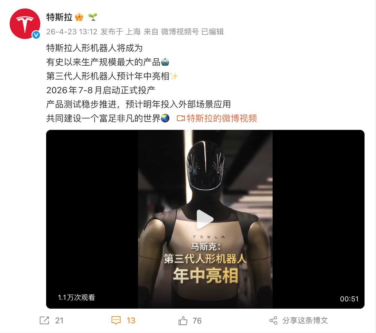 今年 1 月 29 日,特斯拉在发布 2025 年第四季度及全年财报时曾表示,第三代人形机器人将于今年第一季度发布;2 月初,特斯拉官方微博也曾宣称第三代机器人「即将亮相」,并称其可通过观察人类行为学习新技能。