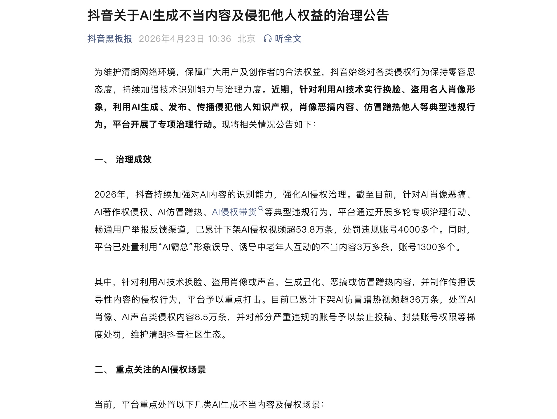 抖音昨日发布《关于 AI 生成不当内容及侵犯他人权益的治理公告》,披露了平台今年以来在 AI 侵权领域的专项治理成效。