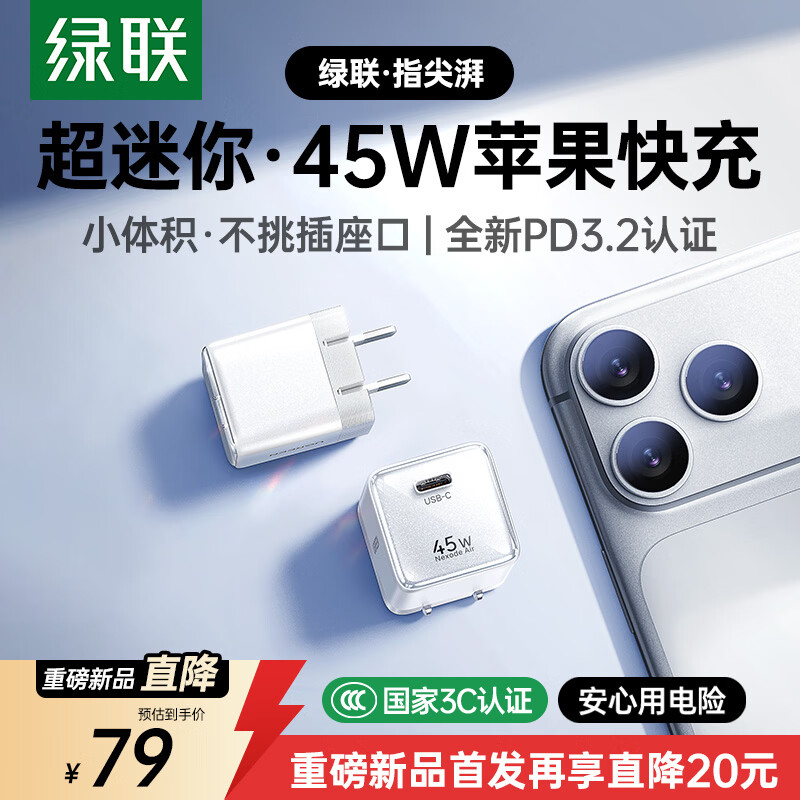 IT之家 4 月 20 日消息,绿联旗下新款指尖湃 45W 充电头现已在京东上架,该充电头支持 PD 3.2 协议,具备 SPR AVS 电压档位,定价为 99 元,首发价 79 元。