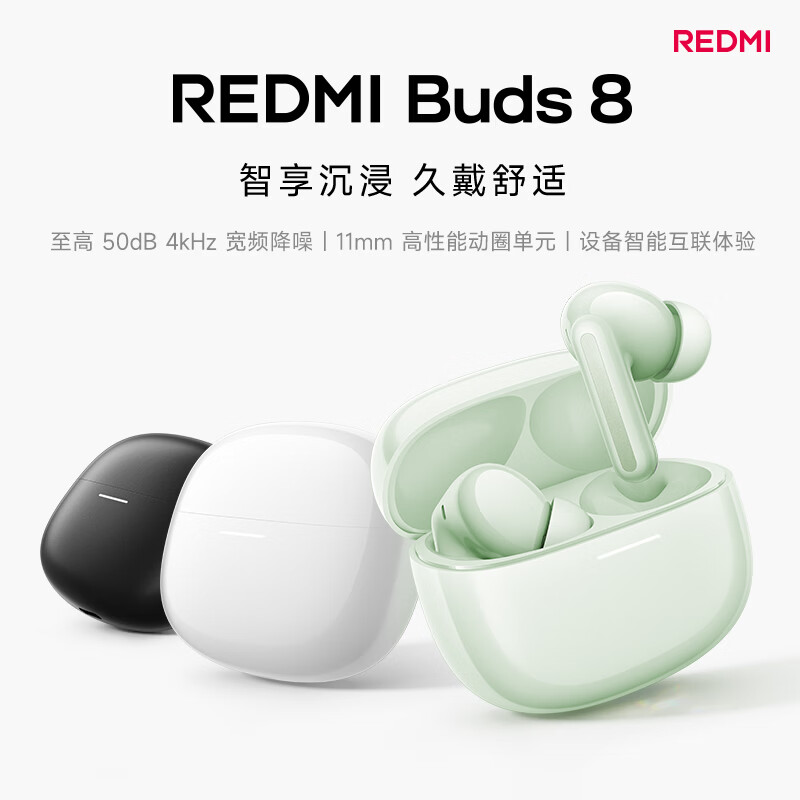 小米 REDMI Buds 8 耳机搭载 11mm 高性能动圈单元,支持 LHDC;平均降噪深度 24.9dB,最高 50dB,有效降噪宽度 4kHz,有 3 档自适应智能降噪同时支持自适应模式,采用小米自研三麦 AI 通话降噪算法。